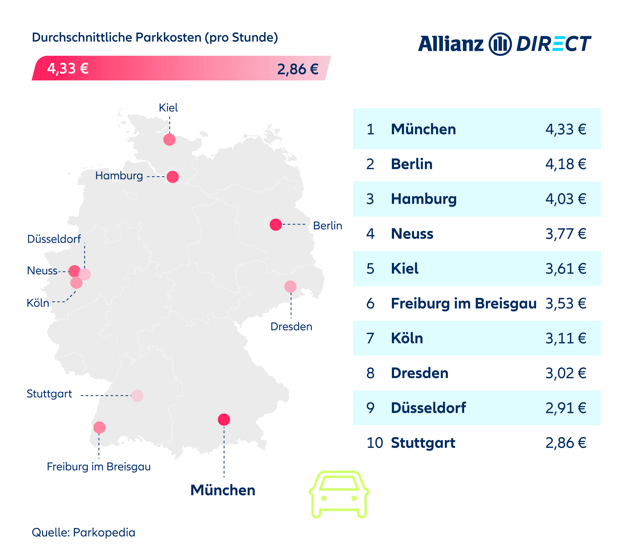 Unter den Städten mit über 100.000 Einwohnern hat München die höchsten durchschnittlichen Parkgebühren. Hier bezahlt man im Schnitt etwa 4,33 € pro Stunde. Auf Rang zwei folgt Berlin, mit 4,18 € pro Stunde knapp dahinter. Nur in München, Berlin und Hamburg (4,03 € pro Stunde) kosten die Parkgebühren im Durchschnitt mehr als 4 € die Stunde.